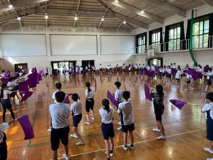 フラッグは3曲目まで練習をしています。今回は千手観音という技に挑戦しています。フラッグが円を描くように広がる姿はとても迫力があります。完成度をもっともっと高めていきましょう!