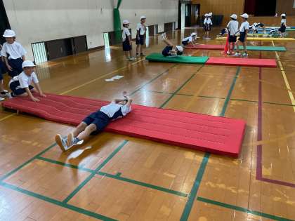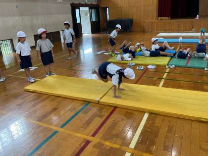 体育科の学習では,マットの上で跳んだり,はねたり,転がったり…。