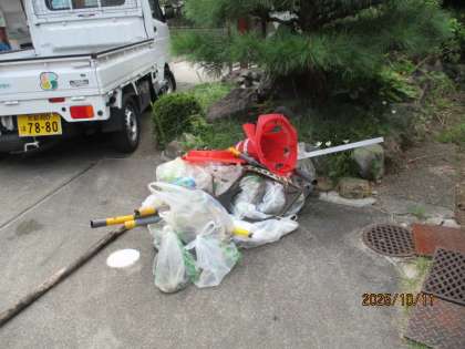午前9時から活動開始ですので、8時40分に学校を出発し、林会長様宅に行きました。そこで服装の準備をし、自己紹介をしてから、活動開始です。ガードレールを乗り越え、川に下り、水の中を進みます。魚やサワガニなどがいっぱいいて、ついついそちらに目が奪われがちなのですが、今回はごみ探しです。ところが、ごみが見つかりません。河原の草の下に絡みついていたり、草の中に埋もれていたり、水中の石の下に潜り込んだりしています。「あんまりごみがあらへんなあ…。」という子どもたちの声も聞こえてきます。上流から下がっていくに連れて少し目が慣れてきたのか、だんだんと見つけられるようになりました。それでも、会長宅でいただいた美化活動のごみ袋がふくらむほどはありません。空き缶、ビニールの紐やシートの端切れ、金属やガラスの破片が少しある程度でした。予定の1時間はあっという間に過ぎ、会長宅に向かっていると、他の会員の方がより下流の方で集めてこられたごみ袋を見て一同びっくり。どの方の袋もいっぱいです。私たちの見つける力が足りないことを痛感しました。