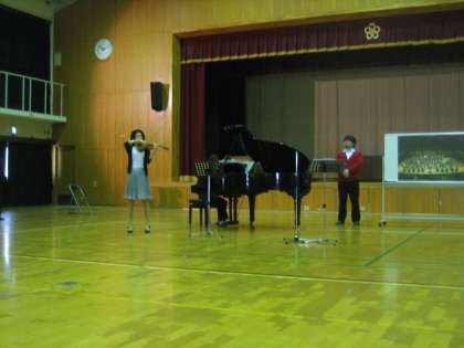 指揮に合わせて,みんなで「さんぽ」「君をのせて」「夕やけ」「ふるさと」を歌いました。それぞれの歌のポイントを教えてもらい,とても上手に歌うことができるようになりました。また,同じ楽譜でも,指揮者の方の振り方ひとつで,曲の雰囲気がガラッと変わることも実感できました。きれいなバイオリンの音色も聞かせていただき,本番がとても楽しみです!
