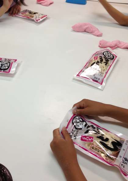 中野うどん学校で,讃岐うどん作りを体験しました。中力粉に塩水を入れ,こねます。その後,足で踏んで,延ばしながらこねていきます。音楽に合わせて楽しくうどん作りを体験しました。