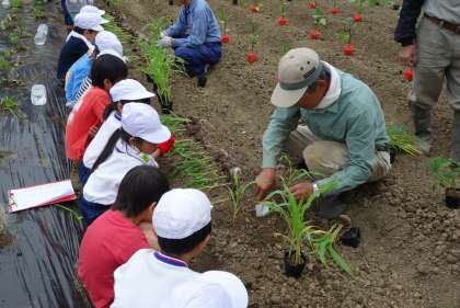 みんな真剣な顔で,「おおきくなあれ」と声をかけながら植えました。