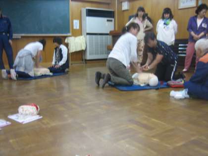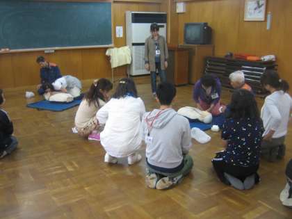 放課後に,ミーティングルームで,教職員対象に救急救命研修を行いました。もうすぐ水泳学習も始まります。万が一の事態に備えて,心肺蘇生法とAEDの使い方を研修しました。