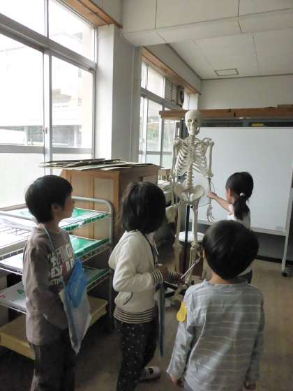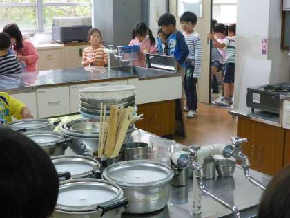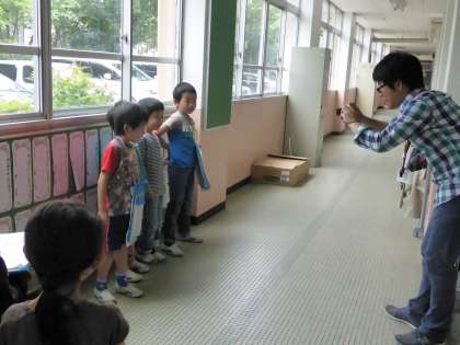 2年生が、1年生に学校の中を案内してくれました。「ここは、家庭科室だよ。お料理を作ったり、ミシンを使ったりするよ。」と説明しながら、教室を紹介しました。クイズを解いたり、スタンプをもらったりしながら、なかよく学校たんけんができました。みんなで記念撮影もして、楽しい時間を過ごしました。
