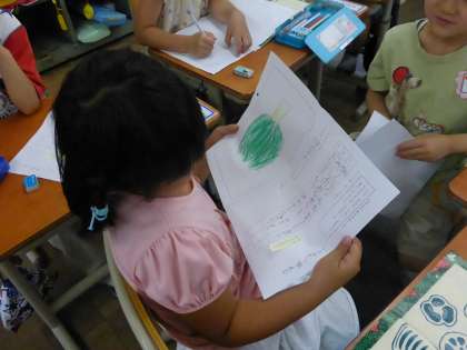 国語の「なぞなぞあそび」の学習の最後に、自分たちでも「なぞなぞ」を作ってみました。やさいの「色」や「かたち」、「味」や「どんなお料理に使われるか」などをヒントにして、問題の出し合いっこをしました。みんな、文も絵も上手にかけました。