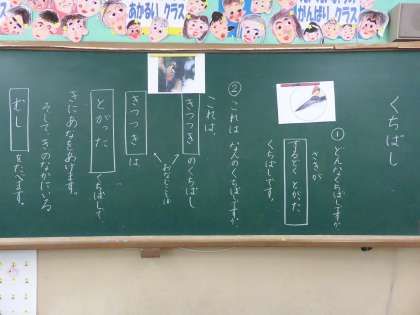国語の「くちばし」の学習をしています。「といかけのぶん」と「こたえのぶん」に注目して、鳥のくちばしの特徴について学習しています。授業の最後には、1時間の学習の感想も書けるようになりました。