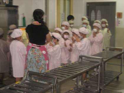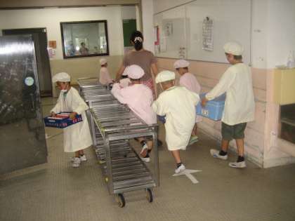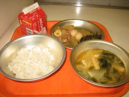 今日の献立は,牛乳,むぎごはん,みそしる,鶏肉のさっぱり煮,こまつなとひじきの炒めものです。給食当番が,給食室に並んで取りに来ます。食器やおかずなど自分の担当のものを友達と協力して教室まで運びます。