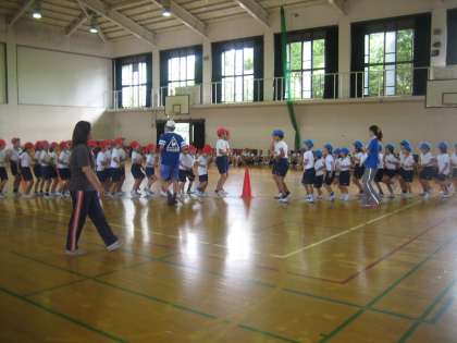 運動場で,エントリー種目のリレーの練習を見ました。高学年はさすがになれたもので,スムーズでした。一回練習した後は,各色に分かれてバトンパスの練習をしていました。体育館では,つなひきと玉入れの並び方を中心とした練習をしていました。