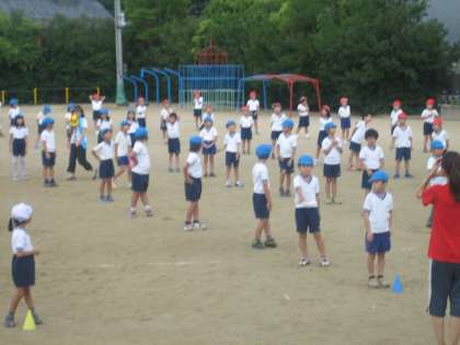 今日は運動場で,自分たちの演技する立ち位置の確認をしました。一度,ばらばらに散歩をした後,笛の合図で覚えた位置に行けるか試してみました。