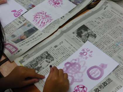 たねの学習をした後、夏休みの間採りためていたあさがおを持ってきました。冷凍していたあさがおをしぼると、きれいな紫色の色水ができました。それを使って、「夏の思い出」の絵を描きました。絵手紙のような素敵な作品ができました。