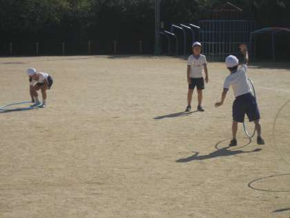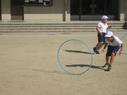 いろいろな用具を使って,楽しく運動をする単元です。今日はフープを使いました。二人一組になって,フープを転がしてキャッチしあいました。距離を広げると,途中で曲がってしまうことがあり難しそうでした。