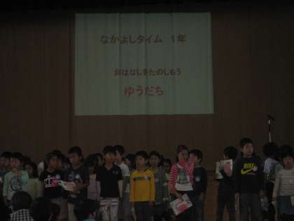 今日は,1クラスごとに音読した後,3名がつづき話を発表しました。「かみなり」や「せみの声」の音も鳴らして,臨場感たっぷりに音読できました。半年間の成長を全校のみなさんに見ていただけて,子どもたちも大満足でした。