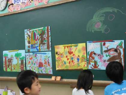 今、図工では、お話の絵を描いています。各クラス2冊の絵本の中からお気に入りの1冊を選び、色画用紙いっぱいに描いています。