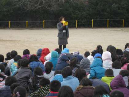 今日は,最初に体育館で防災士の下村様より,地震が起きた時の安全な行動の仕方について,お話をしていただきました。その後,緊急地震速報の放送の後,運動場に避難しました。校長先生からは,「危険物から身を守る集まり方」「まず命を守ること」「家で起こった場合」について,お話がありました。