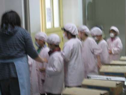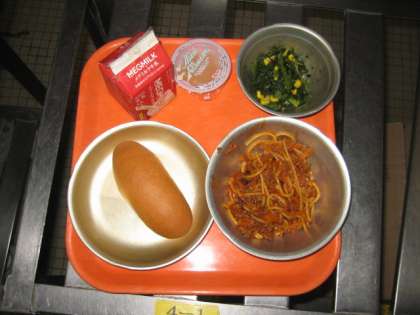 今日から給食が始まりました。今日の給食は,入学祝の献立で「小型コッペパン・牛乳・スパゲティのミートソース煮・ほうれん草のソティー・リンゴゼリー」でした。1年生にとって初めての給食です。給食当番の子どもたちは,エプロンを着るのも,給食当番をするのもゆっくりでしたが,とてもがんばっていました。元気いっぱいの「いただきます」をして,みんなで楽しくおいしく給食を食べました。