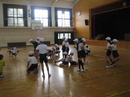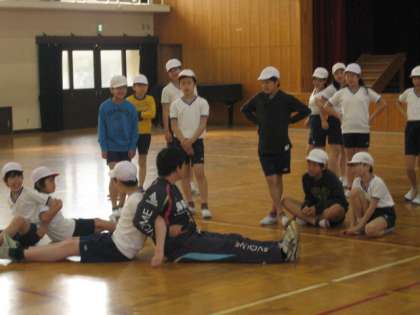 体ほぐしの運動を体育館でしました。担任の先生のお手本を楽しそうにみんな見ていました。実際,自分たちがやってみると難しそうでした。