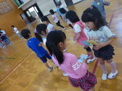 音楽に合わせて歩き,止まったら出会ったお友達と自己紹介し合い,名刺を交換しました。名前と好きなものを伝え,「どうぞよろしくお願いします。」と言って握手しました。