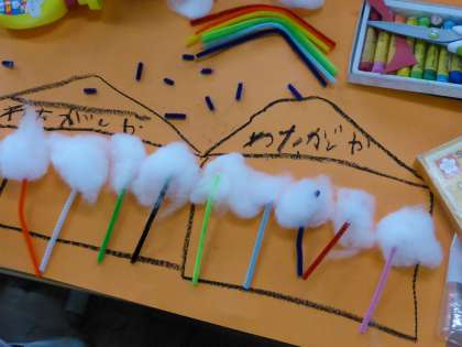 図工で「見つけたよ いいかんじ」の学習をしました。みのまわりの材料を組み合わせたり,つなげたりしながら、どんな絵ができるか考えました。画用紙のどこにおけばいいか考えて,作品をつくりました。色や形を工夫して,楽しい作品ができています。