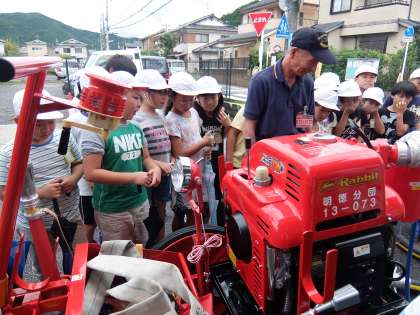 また,明徳消防分団の詰所に行き,倉庫の中などを見せていただきました。