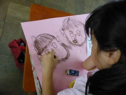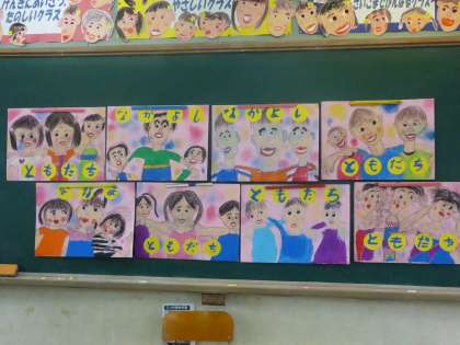 夏休み明けから取り組んでいた「なかよしポスター」ができました。自分を真ん中にして、なかよしの友だちと笑顔で肩を組んでいる絵です。みんな、とてもいい笑顔の作品ができました。