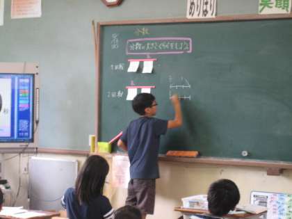 分数の大きさ比べをしました。二分の一と四分の一どちらが多きいかを,線分図や絵図を使って考えました。