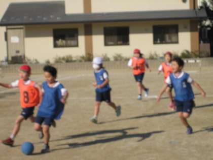 いいお天気の中,ボールけりゲームをしました。簡単なボール操作をしたり,ボールを持たないときの動きを工夫して,ゲームを進めます。