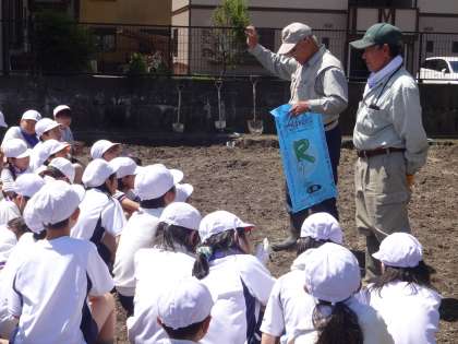 「岩倉の米作り」の学習が本格的に始まっています。今日は,あぜきり体験,水入れを行いました。田んぼとあぜの間にスコップを使い溝を作りました。田んぼに肥料をまくところも見せていただき,子どもたちにとってよい活動となりました。