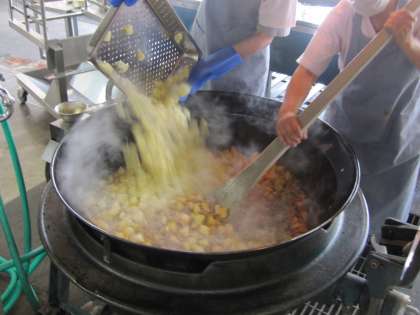 豚肉のケチャップ煮には,豚肉とじゃがいもをトマトケチャップやウスターソース,さとうで調味し,炒めて作ります。じゃがいもは,さいの目切りにし,スチームコンベクションオーブンで蒸してから,釜に入れて仕上げました。