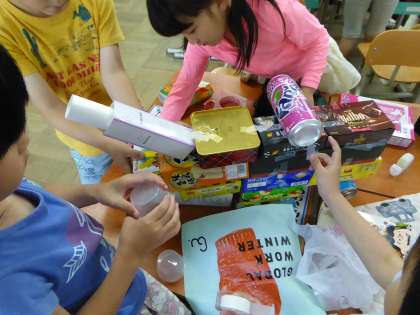 つぎに,いろいろなはこやかんをつかって すきなものをつくりました。ながいくびのキリンや しょうぼうじどうしゃなど いろいろないきものや くるまができました。