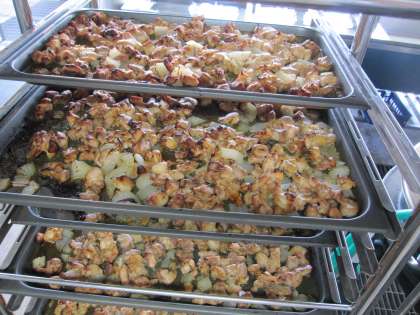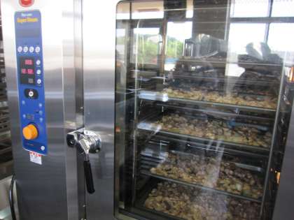 6月6日の給食は「麦ごはん・牛乳・鶏肉のてり焼き・かまぼこと小松菜の煮びたし・すまし汁」でした。「鶏肉のてり焼き」は,スチームコンベクションオーブンで作りました。鶏肉にみりん・しょうゆなどで味つけし,スチームコンベクションオーブンで,蒸し焼きにしました。