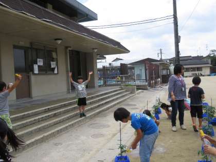 と,子どもたちは自分のミニトマトにたっぷりお水をあげました。
