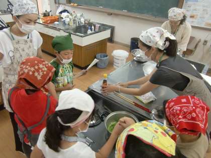7月14日,3年1組と2組で自分たちの畑で収穫した京野菜の調理をしました。保護者の方にも来ていただき,後ろで見守っていただきながら自分たちで調理しました。