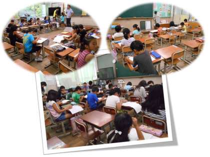 夏休みが始まりました。今日,明日とサマースクールです。早くから登校し,部活動の練習に参加する人やいつも通り登校し,9時から開始のサマースクールですが,いつも通り登校し,どうのように時間を使おうと悩んでいた子,9時前には多くの子どもたちが登校し,学習にむかいました。そのあと,5・6年生の中にはめだか教室に参加し,目標に向かって練習に励んでいました。