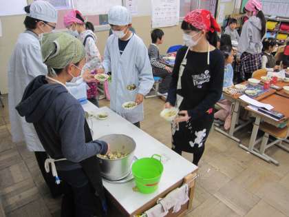 3月2日の給食は,「麦ごはん・牛乳・肉じゃが・切干大根の煮つけ・黒大豆」でした。今日は,たてわり給食で,1年生から6年生のたてわり班に分かれて給食を食べました。5・6年生が給食当番になり,低中高と量を変えながら,上手に配膳していました。