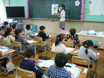 今日は鉛筆の持ち方を練習しました。先生の説明をしっかりと聞く子ども達。上手になぞり書きができていました。となりのクラスでは,詩を読む授業。先生に続いて,背筋を伸ばしてゆっくりと大きな声で読む姿が素敵でした。