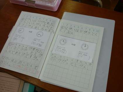 先生の話をしっかりと聞き,時計を操作する子ども達。ノートもこんなに丁寧に書けます。毎日の積み重ねが,子ども達を大きく成長させるのです。子どもにとっての1年という月日の重みを感じる出来事でした。