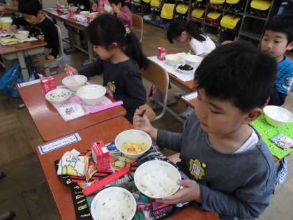 1年生もだいぶ給食の準備に慣れてきて,手際よく準備できるようになってきました。