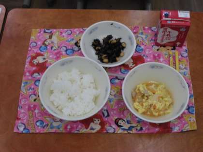 今日の親子煮はだしがよく効いていて,卵もやわらかく,子どもたちはおいしそうに食べていました。ひじき豆もだしを取って作られており,箸休めとしておいしく食べられたようです。ひじきが好きな1年生が多く,しっかりと食べられていました。
