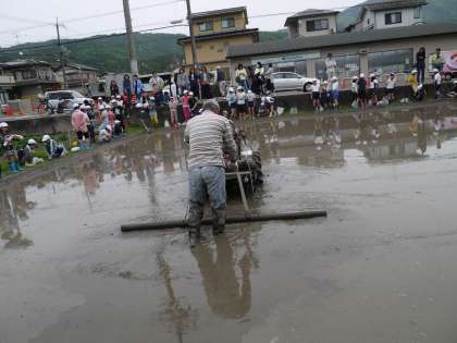 今日は,田んぼの本ごなしの見学をさせていただきました。先週のあぜぬりから一週間が経ち,あぜの様子を子どもたちが観察しながら「しっかり固まってる!」と声が上がっていました。耕うん機を動かして,土と水がしっかりと混ざりました。耕うん機が入らない四隅の部分は,手作業で土をほぐします。これで,隅にまで苗を植えることができます。そして,最後に「まんが」という器具を耕うん機に結び付けて,平らに均す作業も見学をしました。この作業をすることで,苗が植えやすくなるそうです。いよいよ来週は田植えです。あぜきりから始まり,一つ一つの作業が次に繋がっています。子どもたちも一つ一つの知識と経験がより深い学習へとつながっていくでしょう。今日も,田んぼの先生方にたくさんのことを教えていただきました。ありがとうございました。