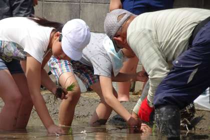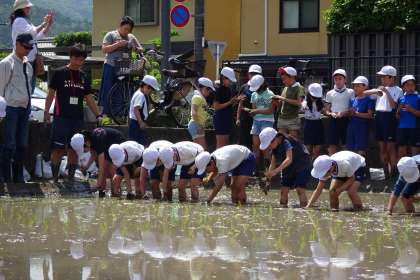 田んぼの中に足を入れた瞬間,子どもたちから口々に声が上がりました。田んぼの端から端までぴんと張った紐には,苗を植える間隔がわかるよう印がつけてあります。その印に合わせて,苗を植える→一歩下がる→土を均すの作業を繰り返しました。また,機械でもち米の苗を植える様子も見学させていただきました。おいしいお米ができますように…。