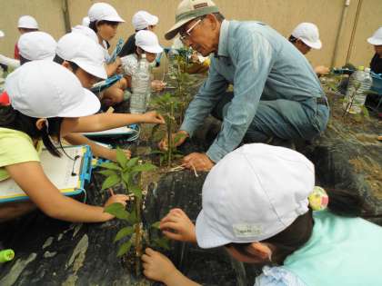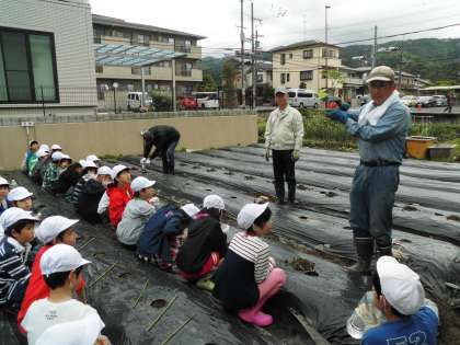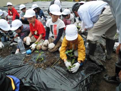 5月10日(水)に賀茂ナス・万願寺トウガラシ・伏見トウガラシの苗植えをしました。みんなの願いが通じたのか,雨も上がり,苗の植え方やコツを畑の先生に丁寧に教えていただき,2人に1本の苗を大切に植えることができました。生長がとても楽しみです。