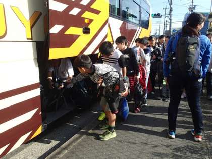 さわやかな青空の下,6年生87人全員が元気に出発しました。