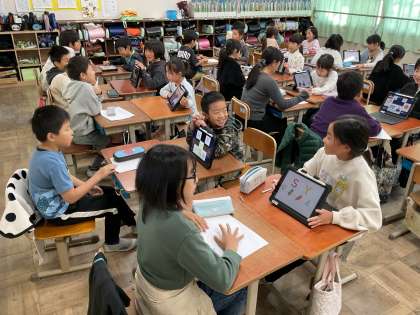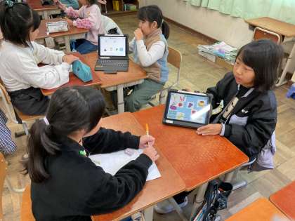 今日は外国語活動の学習で、3年生が4年生に向けて自己紹介をしました。4年生からはインタビューを受ける場面もあり、楽しい交流の時間となりました。この日のために、子どもたちは自己紹介カードを作り、何度も練習を重ねてきました。