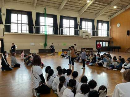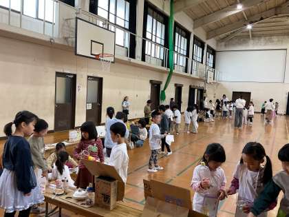 今日は、明徳幼稚園とセヴァ子ども学園の年長の皆さんを招待し、秋を使ったおもちゃで一緒に盛り上がりました。体育館には、1年生の子ども達が準備したお店が並び、各お店では子ども達がこれまでに制作したおもちゃの紹介が聞けたり、一緒に遊ぶことができたり、お客さんを楽しませるための工夫が盛りだくさんでした。