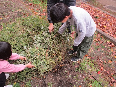 明徳小の中庭で育てていた落花生が大きな実を付け、食べごろになっていたので収穫しました。落花生は名前の通り、落ちた花のところに根を張りそこに実(落花生)ができるのですね。子どもたちは、初めて実がなっているのを見て驚いていました。収穫はとても簡単で、引っこ抜くだけ。しかもするすると抜けます。抜いた後ははさみで切り分け、茹でて食べました。普段食べる固いものと違い、茹でたものはホクホクしてお芋のような味でした。「おいしい!」といくつも食べる子もいれば、お口に合わなかったようで、1つだけしか食べなかった子もいました。これも経験ですね。たくさんあったので、余った分は職員室へお裾分け。食べた先生たちはおいしいと喜んでくれました。
