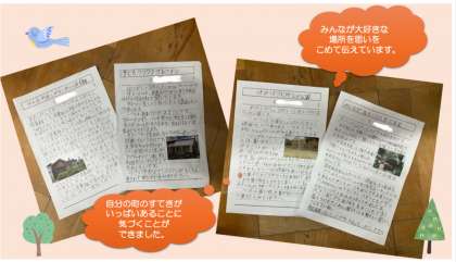 自分が住む地域のいいところを紹介する文章を書きました。どんなところを紹介したいかを考えて、どうして紹介したいのかその理由や自分の思いが伝わるように書きました。読む人が、興味をもってくれるようにどんなことを書けばいいか。どんな順番で紹介しようかと悩みながら書いたので、読んでいるとわくわくしてきます。