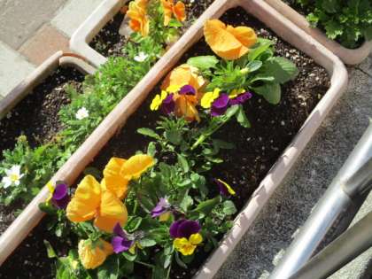 朝の潅水は凍結もありうるこの時期、陽が当たるとプランターは少し乾き気味。ちょうどいい時間に水で潤してくれています。おかげでパンジーは多くの色を見せてくれており、春にはどのような株になっているか今から楽しみです。