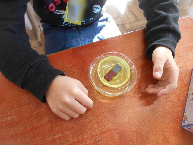 お皿にのせた棒磁石を水面に浮かせ