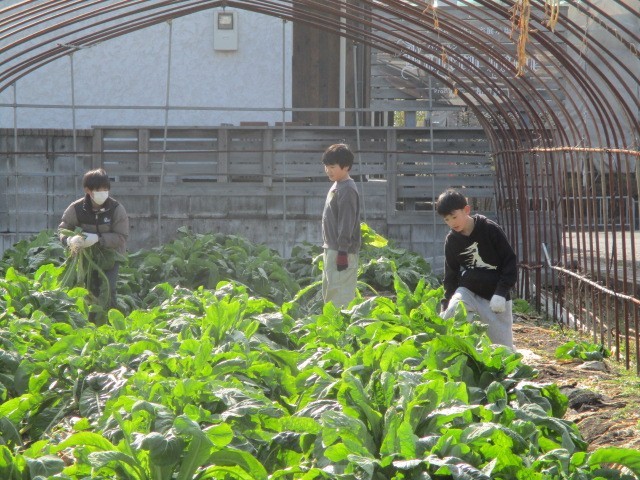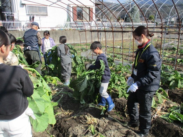 この日も寒い日でしたが、2月としてはましな方。それでも手がかじかむ中、畑の先生方に抜き方などを教えていただき、葉や土の後始末もしていただきました。昨年に続いての収穫作業で、体格も大きくなっているので、少し手慣れたふうに見られました。できるだけ大きいすぐきを目指して、葉の下をのぞき込み、上手に引き抜くと、立派なすぐきが顔を出します。「大きい!」という歓声があちらこちらから聞かれました。