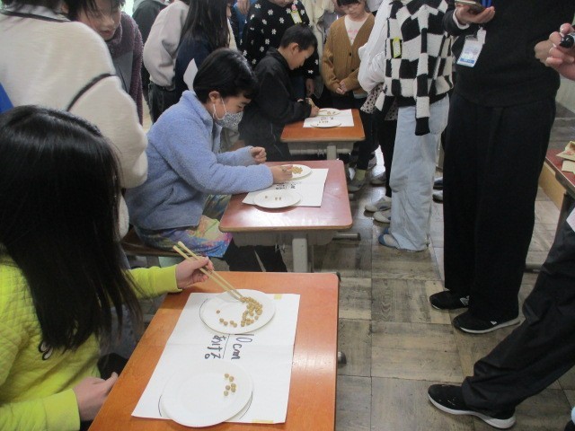 そして2月3日、決戦の日。各学級のチャンピオンが出揃い、多目的室で熱い戦いが繰り広げられました。割り箸を片手に、全集中が、大豆一粒一粒に向けられました。友だちの声援の中、出場者は真剣な表情で取り組んでいます。箸先に集中し、摘まむテンポをつかむと、次々に隣のお皿に大豆が移動していきました。その速さに、応援団も思わず息を呑んでいました。その結果、4年3組がチャンピオン。代表3人とも、40秒で20粒越えの好記録でした。